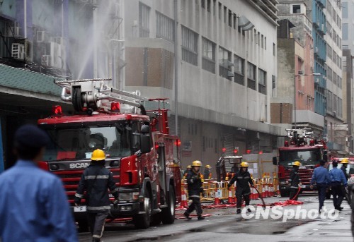 3月8日,香港长沙湾丽昌工厂大厦发生四级火警,焚烧大约6小时后下午救熄。火警中有一名消防队目殉职,3名消防员受伤,其中两人情况严重。中新社发 郑祚声 摄