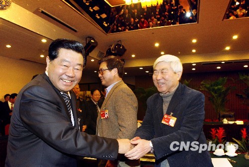 图为贾庆林主席与全国政协委员、空间技术专家戚发韧握手。中新社发 张宇 摄