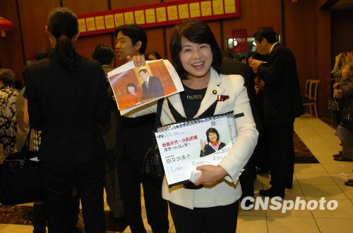 日本参议院议员姬井由美子带着和胡锦涛主席的合影出席酒会。中新社发 段跃中 摄