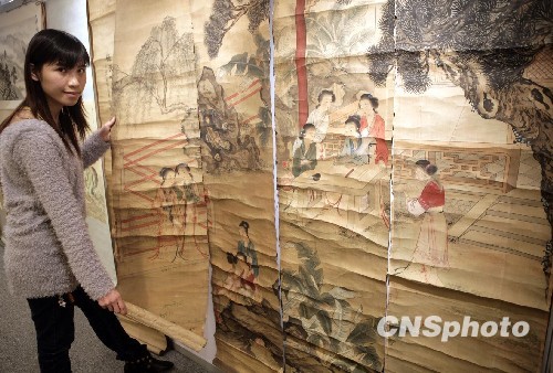 图为展出的常州著名画家房师钿之《仕女五通屏》。中新社发 张勤 摄