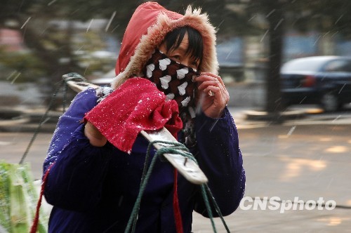 图为傍晚时,安徽巢湖忽然下起大雪,令出行的市民措手不及。中新社发 徐振华 摄