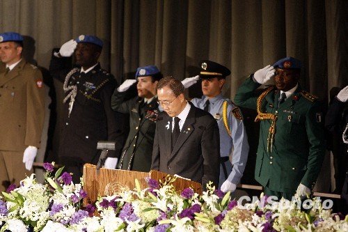 联合国9日在纽约总部举行仪式,悼念在今年1月12日海地大地震中遇难的101名联合国工作人员,其中包括4名中国维和警察。图为联合国秘书长潘基文带领在场所有人为死难者默哀一分钟。中新社发 孙宇挺 摄