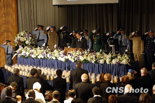 图为联合国秘书长潘基文带领在场所有人为死难者默哀一分钟。中新社发 孙宇挺 摄