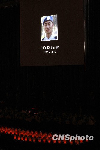 图为悼念活动进行过程中,现场工作人员正在宣读中国维和警察钟荐勤的名字。中新社发 孙宇挺 摄