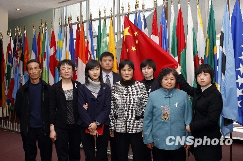 图为仪式结束后,在联合国万国旗下,中国维和英烈的8名亲属在五星红旗下留影纪念。中新社发 孙宇挺 摄