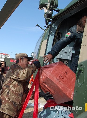 甘肃酒泉市部分地区遭受雪灾,3月9日下午,新疆军区调派了两架直升飞机在玉门市装运救灾物资,为受困严重的农牧民空运去棉被、方便面、矿泉水、面粉等受灾物资。中新社发 方圆 摄