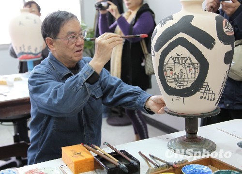 50名两岸及海外华人艺术家从3月9日至12日应邀在台湾金门县陶瓷厂进行酒瓶彩绘创作,这些艺术瓷瓶烧制完成之后,将每只灌入5公斤金门高梁酒送往上海,参加5月1日在上海世博会首展的“百年华人绘画大观·世界巡回大展”。图为3月9日,艺术家正在金门县陶瓷厂的彩绘车间进行创作。中新社发 耿军 摄