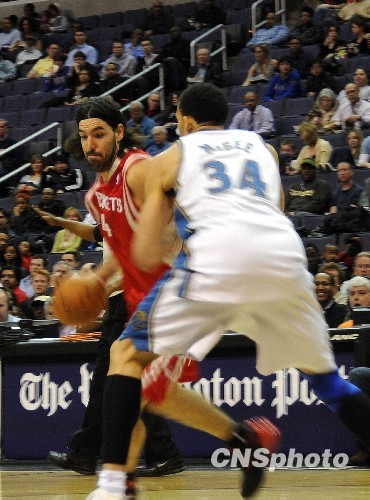 当地时间3月9日晚,美国NBA火箭队作客华盛顿,在中国球员姚明缺阵的情况下以96-88击败奇才。路易斯·斯科拉成为火箭第一功臣,他拿下全场最高的23分,并贡献10个篮板。他已连续3场得分超过20分。图为斯科拉试图突破。中新社发 李静 摄