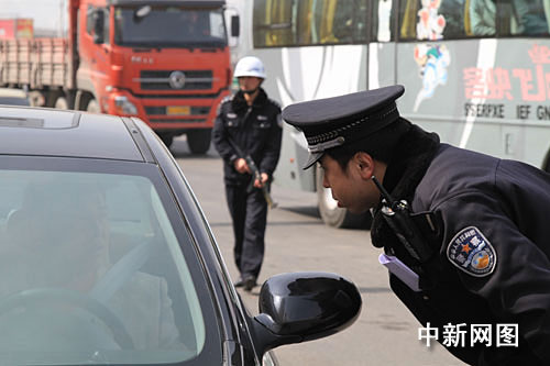 图为10日午时,民警查看出城车辆,并提醒司乘人员注意安全。殷春永 摄