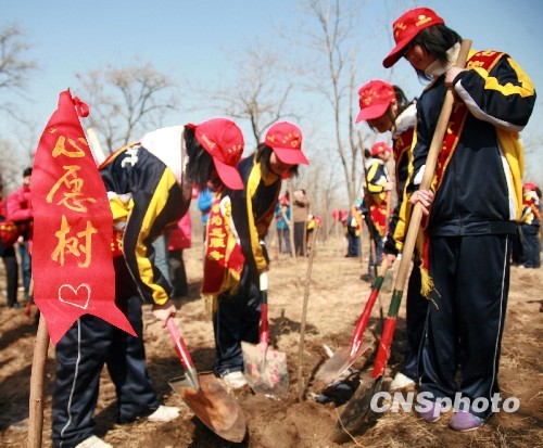 3月10日,河北石家庄旅游学校40余名四川平武灾区的学子与该市公交四公司百余志愿者,共同在燕赵大地种下512棵象征友谊的火炬树。一名学生将自己亲手制作的祝福卡系在小树上,祝愿关怀、帮助她们的公交四公司叔叔阿姨和学校老师永远平安、幸福。图为女学生把祝福卡系在树上。中新社发 翟羽佳 摄