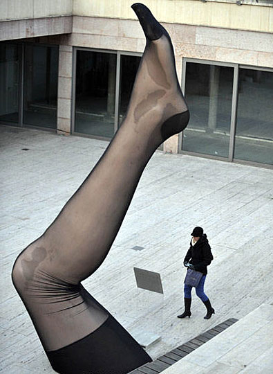 一名参观者走过穿黑色丝袜腿部的巨型雕塑。