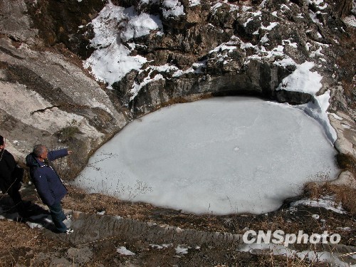 3月11日,中国地质专家在太行山脉北段河北顺平境内白银坨发现一座绵延约3公里的罕见“壶穴”群。图为中国旅游地学研究会专家张永胜在实地介绍单个壶穴成因。 中新社发 吕子豪 摄
