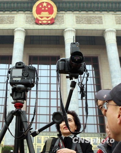 会前,在广场上两台无人看管并在自动拍摄的相机引起了不少人的好奇。中新社发 汤彦俊 摄