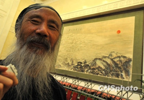 全国政协委员、中国道教协会会长任法融3月11日在北京出席全国政协十一届三次会议接受采访,他身后的巨幅国画《江山如此多娇》上所描绘的,正是道教名山秦岭的大好河山景象。中新社发 贾国荣 摄