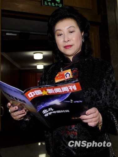 3月11日,人大举行全体会议,全国政协委员李嘉音穿着旗袍列席会议后在人民大会堂阅读会议相关报道。中新社发 廖攀 摄