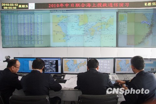 3月12日上午,江苏省水上搜救中心与日本海上保安厅第八管区舞鹤分部在南京和日本舞鹤成功举行“2010中日联合海上搜救通信演习”。两地分别模拟了搜救中心、遇险船舶、船公司等不同角色,相互演练了特定海域船舶碰撞进水、主机故障失、人员伤病等假想情况下双方搜救中心接收报警、查核险情及组织开展联合搜救行动期间的协调通信。整个演习过程持续近90分钟,演习工作语言为英语。