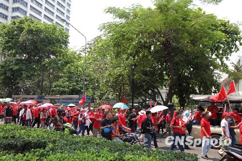 图为12日中午一支近千人的红衫军在曼谷市中心的伦披尼公园前游行示威。中新社发 顾时宏 摄