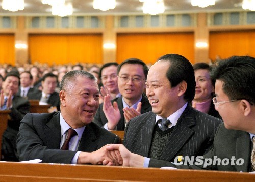 列席会议的海外侨胞与何厚铧握手祝贺。中新社发 廖攀 摄