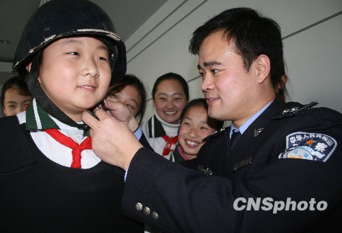山东博兴县公安局举办“警营开放日活动”,该县博奥小学的同学与警营“零距离”接触,感受警察风采。中新社发 陈彬 摄