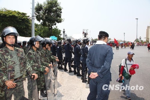 图为泰国军警驻防在红衫军集会示威主会场潘帕桥和拉差丹能路街头,应对红衫军的示威活动。中新社发 顾时宏 摄