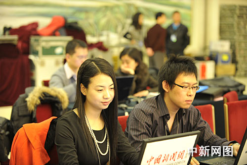 3月14日上午十一届全国人大三次会议闭幕后(预计10时),国务院总理温家宝将在人民大会堂三楼金色大厅与采访十一届全国人大三次会议的中外记者见面并回答记者提出的问题。图为中新网工作人员已经在金色大厅就位,做好直播前的准备。中新网发 吴歆 摄