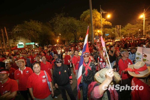 泰国红衫军入夜在五马广场一带集会。中新社发 洪少葵 摄