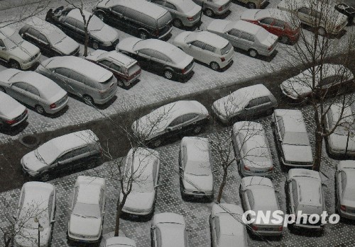 石景山区杨庄一社区里停放的汽车被雪覆盖。中新社发 李文明 摄
