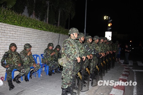 图为守卫在五马路附近的泰国军人彻夜执勤。中新社发 顾时宏 摄