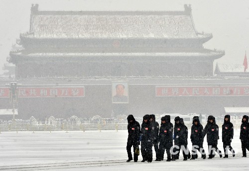 服务人员走过大雪纷飞的北京天安门广场。中新社发 贾国荣 摄