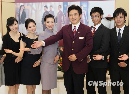 16名“亲善大使”从1月30日起接受台湾中华航空公司空服训练教师(中)的培训,学习亲切得体的待客技巧。中新社发 耿军 摄