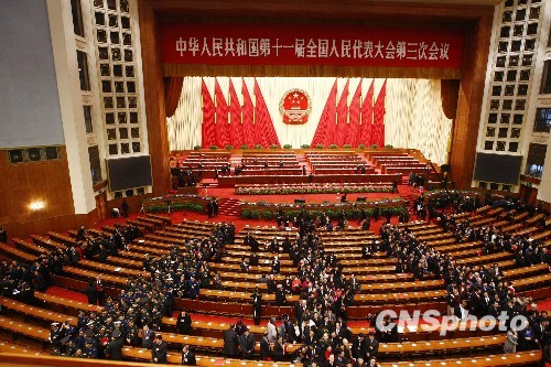 代表分别表决通过了关于政府工作报告等八项决议草案后落下帷幕。中新社发 杜洋 摄