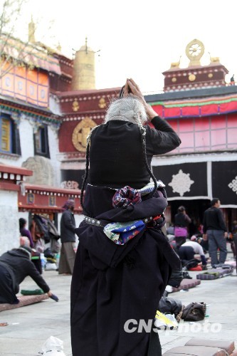2010年3月14日,西藏拉萨“3·14”事件发生两周年。上午9时许,拉萨大昭寺广场上,信众虔诚朝佛。当日,大昭寺正常开放。中新社发 徐长安 摄