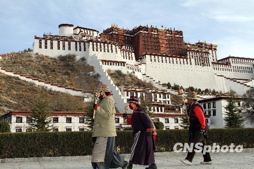 3月14日,西藏拉萨“3·14”事件发生两周年。上午九时许,布达拉宫前信众一如寻常转经朝拜。中新社发 徐长安 摄