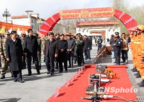 3月13日下午,两名驻哲蚌寺消防队员进行例行防火巡查。消防队的主要工作是防范和保护寺内古建筑和文物免遭祝融之灾。中新社发 徐长安 摄