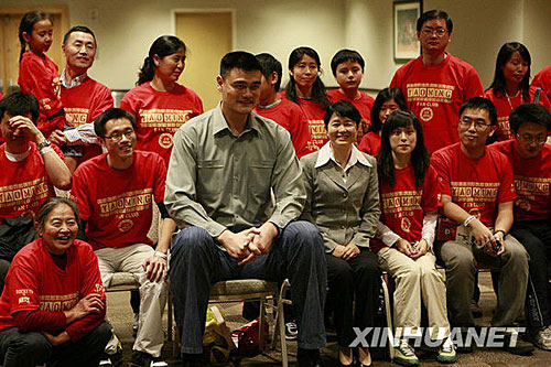 火箭队球员姚明与姚明球迷俱乐部成员合影。