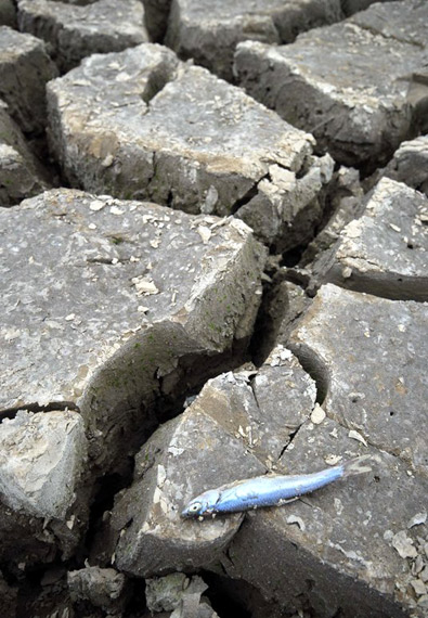一条小鱼干死在水库底部龟裂的於泥上。乔啟明 摄