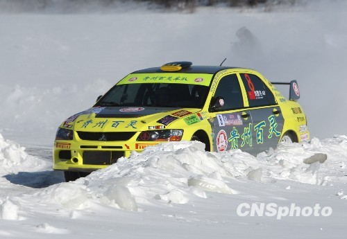 2010年中国汽车拉力锦标赛漠河站14日在北极村的黑龙江冰面上举行。来自中国内地的72辆赛车冒着零下20多度的严寒参加本站比赛,贵州百灵车队刘曹冬目前领跑中国车手,名列第一。