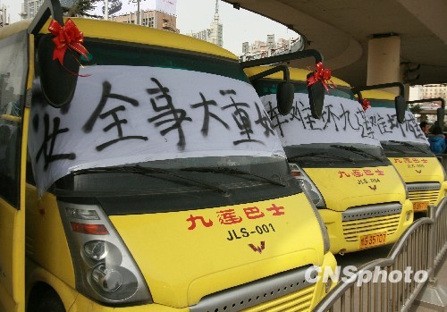 3月15日,是国际消费者权益日,河南九连山景区将购买的某公司“问题客车”挂上标语在郑州街头公开展示。中新社发 王中举 摄