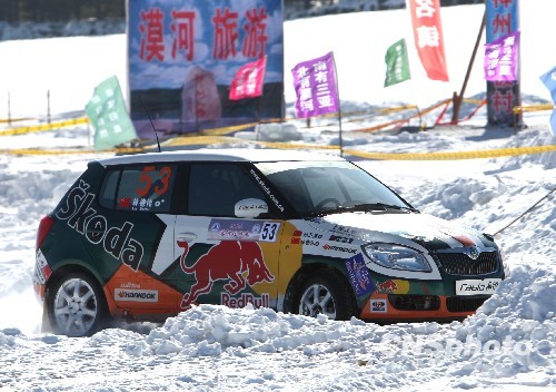 2010年中国汽车拉力锦标赛漠河站15日北极村的黑龙江冰面上结束,今年刚刚加入上海大众斯柯达红牛车队的台湾小将林德伟,驾驶53号晶锐赛车获得1600cc冠军。中新社发 赵振清 摄
