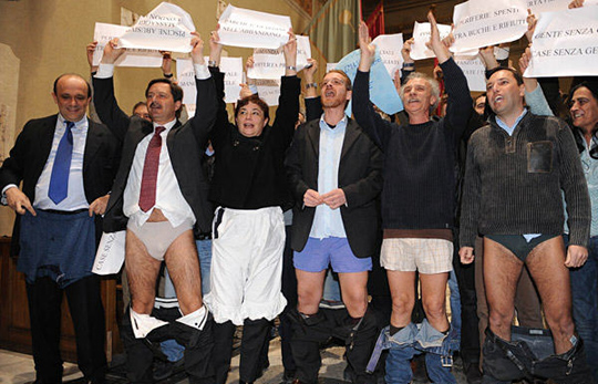 3月15日,在意大利首都罗马,来自左翼政党的市政官员在市政厅以脱裤子方式表达不满。呼吁来自中右翼政党自由人民党的罗马市长詹尼·阿莱曼诺尽快通过本市2010财政年度预算。