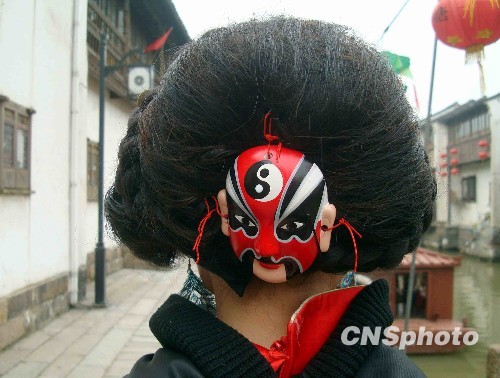 2010年3月15日,江苏苏州山塘古街街头,一名穿着时尚的姑娘头戴着京剧脸谱发饰,“前后”吸引众多行人目光。 中新社发 王建康 摄