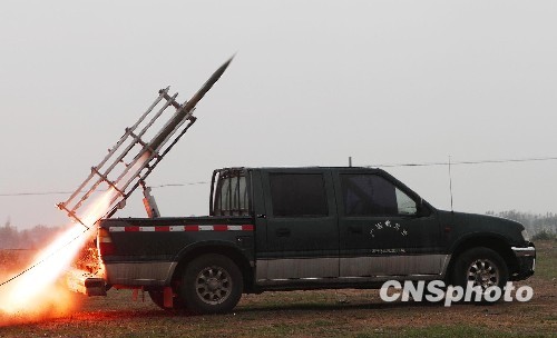 3月16日傍晚,广西钦州市人工影响天气办公室火箭人工增雨作业小组在该市两个作业点实施人工增雨作业,共发射8枚人工增雨火箭弹。据悉,高温少雨导致广西近期旱情迅速蔓延,截至3月11日统计,广西有12个市出现旱情,农作物受旱面积784.45万亩,因旱导致176.46万人、87.09万头大牲畜饮水困难。图为火箭弹在发射架上点火发射。中新社发 曾开宏 摄
