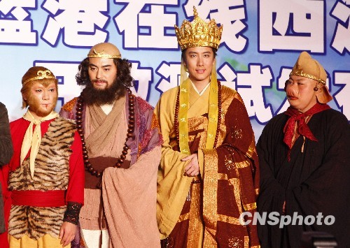 3月16日,新版《西游记》孙悟空扮演者费振翔、唐僧扮演者陈司翰等“师徒四人”带妆亮相北京,为即将于3月19日开放测试的国产网络游戏《西游记》助阵。中新社发 李学仕 摄