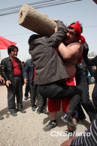 一村民“大力士”肩扛340公斤的石碾,石碾两端再加两名80公斤的汉子,展示力量。中新社发 卫行智 摄
