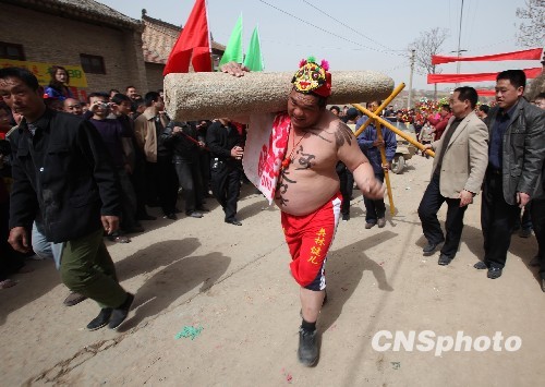 一村民“大力士”肩扛340公斤的石碾,展示力量。中新社发 卫行智 摄