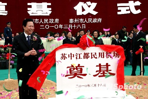 3月18日,由江苏扬州、泰州两市联合共建的苏中江都民用机场奠基仪式在扬州江都举行,扬州市委书记王燕文主持奠基仪式。新建的苏中江都机场,占地2291亩,总投资约9.74亿元,距离扬州主城区直线距离约30公里,泰州约20公里。机场工程近期按满足150万人次的年旅客吞吐量设计,飞行等级标准为4C级,预留4D发展空间,预计于2012年正式通航。