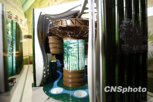 3月18日, 国际竹藤组织(INBAR)在北京发布2010年上海世博会展馆模型。国际竹藤组织将在国际组织联合馆中设立独立展馆,展馆的主题是“竹藤-人居-环境”,这个主题是为了更好地推广倡导竹藤的使用,在降低碳排放的同时,达到减少贫困、环境保护和促进全球平等贸易的目标。中新社发 杜洋 摄