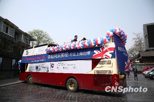 3月18日一辆英国世博双层巴士抵达成都宽窄巷子。成都做为全中国巡游的首站,此次世博大巴西南行旨在宣传上海世博会英国馆及相关活动,英国驻重庆总领事尉渟翰亲自与英国公共交通专家一起乘坐世博大巴并与成都分享伦敦的先进交通管理经验,鼓励市民使用公共交通工具出行。中新社发 张浪 摄