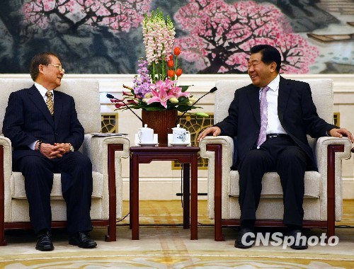 3月18日,中共中央政治局常委、全国政协主席贾庆林在北京人民大会堂会见饶颖奇先生率领的“2010台湾民意代表交流参访团”成员时,与饶颖奇先生亲切交谈。