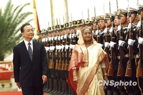 3月18日,中国国务院总理温家宝在北京人民大会堂举行仪式,欢迎孟加拉国总理谢赫·哈西娜访华。中新社发 盛佳鹏 摄